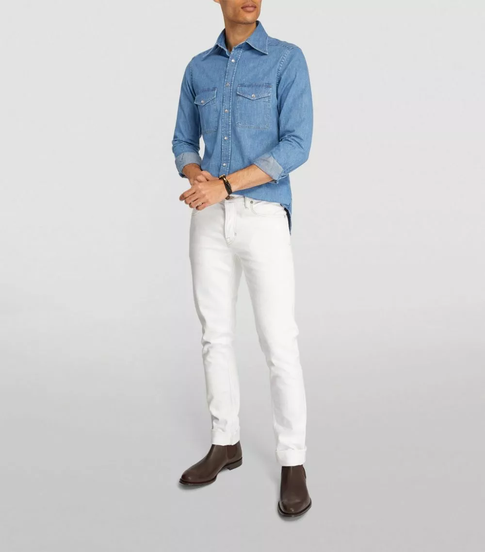 Leave it to TOM FORD to put a sophisticated spin on the denim shirt; its iteration borrows just the right amount of inspiration from the Wild West, creating a refined piece that will serve you for seasons to come. Rendered in a classic mid-wash shade, the lightweight shirt is accentuated with subtle takes on the cowboy theme – flap pockets to the chest, for example, and a slim fit that calls to be tucked into trousers, or even your blue jeans.How to wear Harrods: Style with jeans and Chelsea boots.