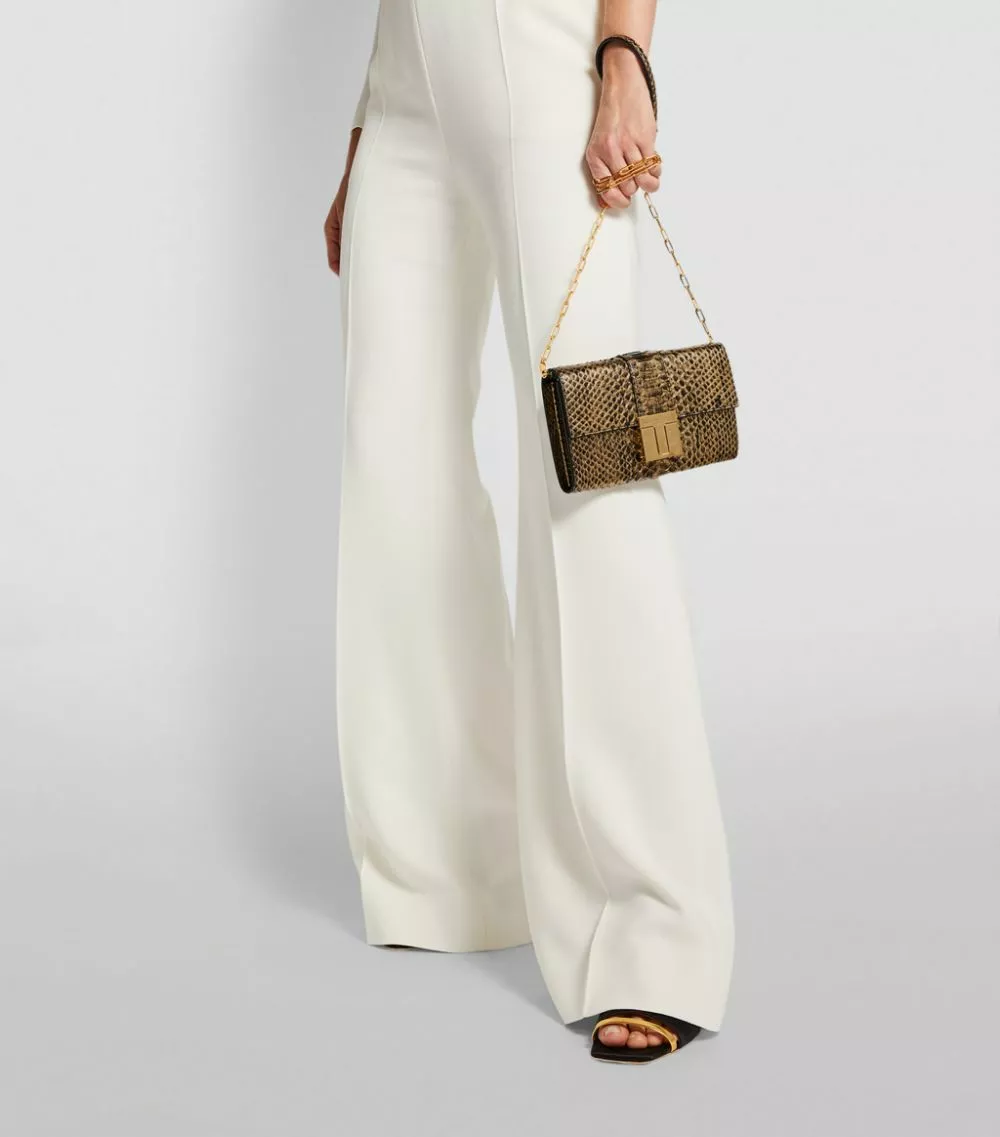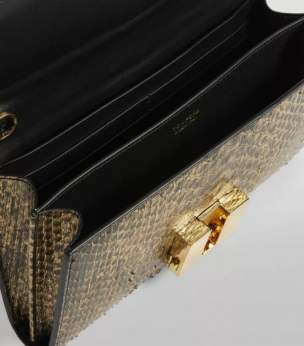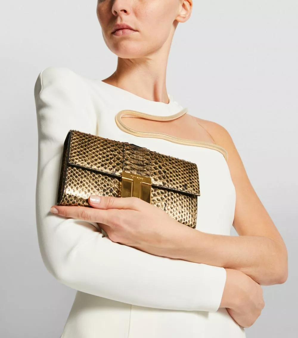 Exemplifying the label’s affinity for luxury fabrics, this TOM FORD clutch bag is rendered in metallic python skin for a sleek runway-worthy finish. Further accented by the label’s polished T clasp in an antiqued-gold finish, this petite accessory is suspended from a delicate chain strap and perfectly complements your best eveningwear.