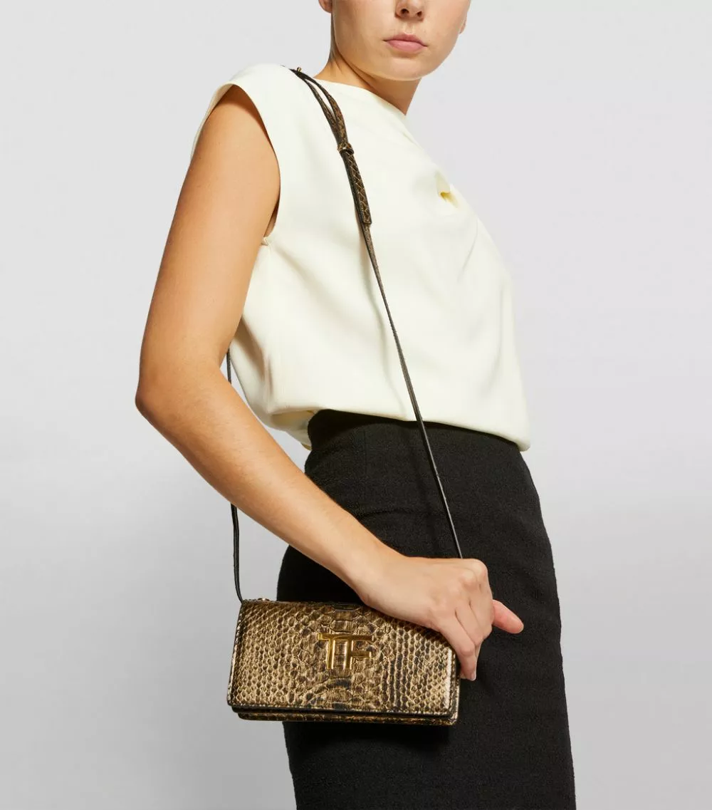 Exemplifying the label’s affinity for luxury fabrics, this TOM FORD clutch bag is rendered in metallic python skin for a sleek runway-worthy finish. Further accented by the label’s crystal-embellished TF monogram, this petite accessory is suspended from a chain strap and perfectly complements all-black ensembles.