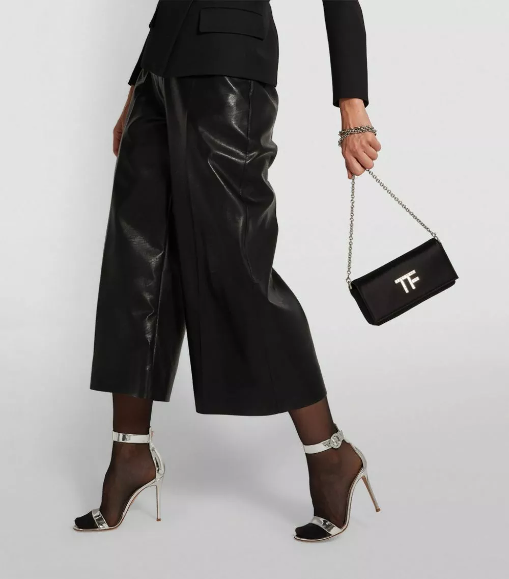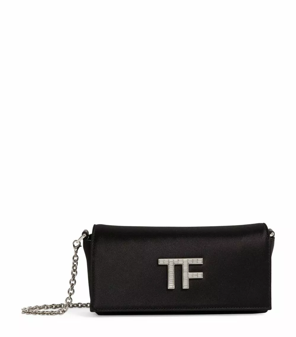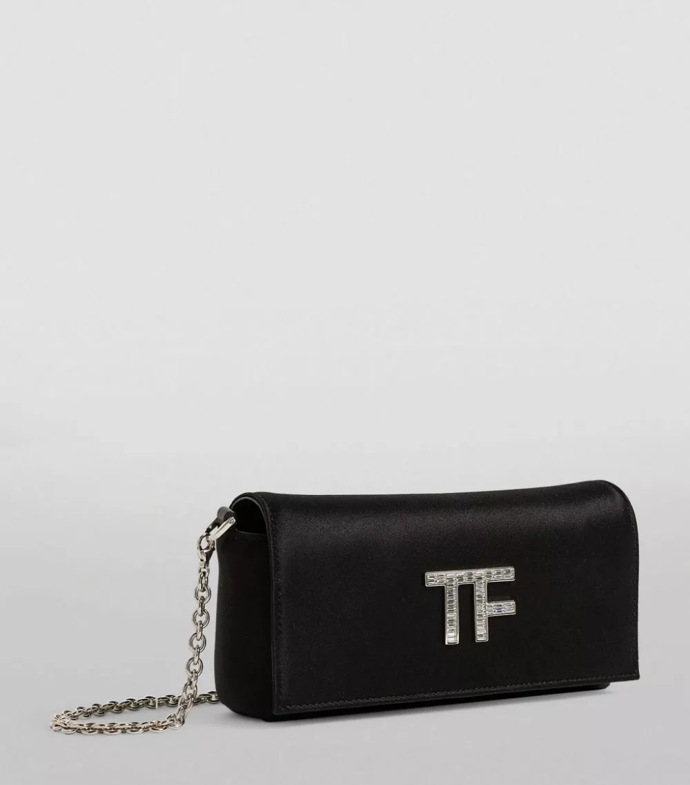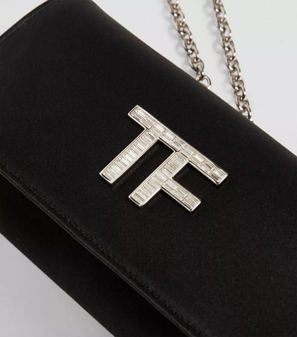 Perfect evening ensembles with TOM FORD’s elegant clutch bag. Crafted in delectably sumptuous satin, it features the iconic block-letter logo to the front in shimmering Swarovski crystals. Finished with silver-tone hardware, it makes for a sleek partner to your finest occasionwear.